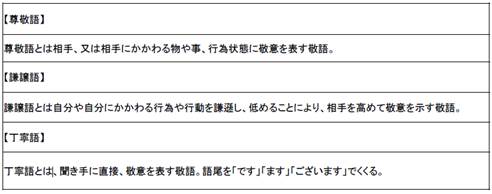 次の表は、日常よく使う言葉ですが、尊敬語、謙譲語、丁寧語で言ってみてください。
