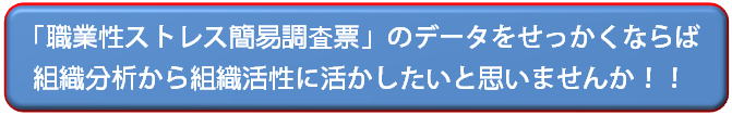 「職業性ストレス簡易調査票」をさらに詳細に分析すると、組織の中で一体何が起こっているのか、もしくは起こり始めているのかが見えてくることがあります。そのデータから、組織が活性するためのヒントを得られることもあります。さらに別のチェックツールを組み合わせることで、より具体的に提案させていただける可能性もあります。