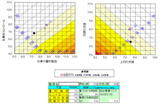 「職業性ストレス簡易調査票」には、組織内のストレス度をチェックする項目と、自発性などの組織の活性度をチェックする項目が設定されています。ここに組織の総合リスクを合わせて、それぞれの項目のバランスから、その組織がどういう状況にあるのか、さらに活性するには何をすれば良いのかが割り出せます。全社、部署別など、様々な視点から状況分析と提案が可能です。